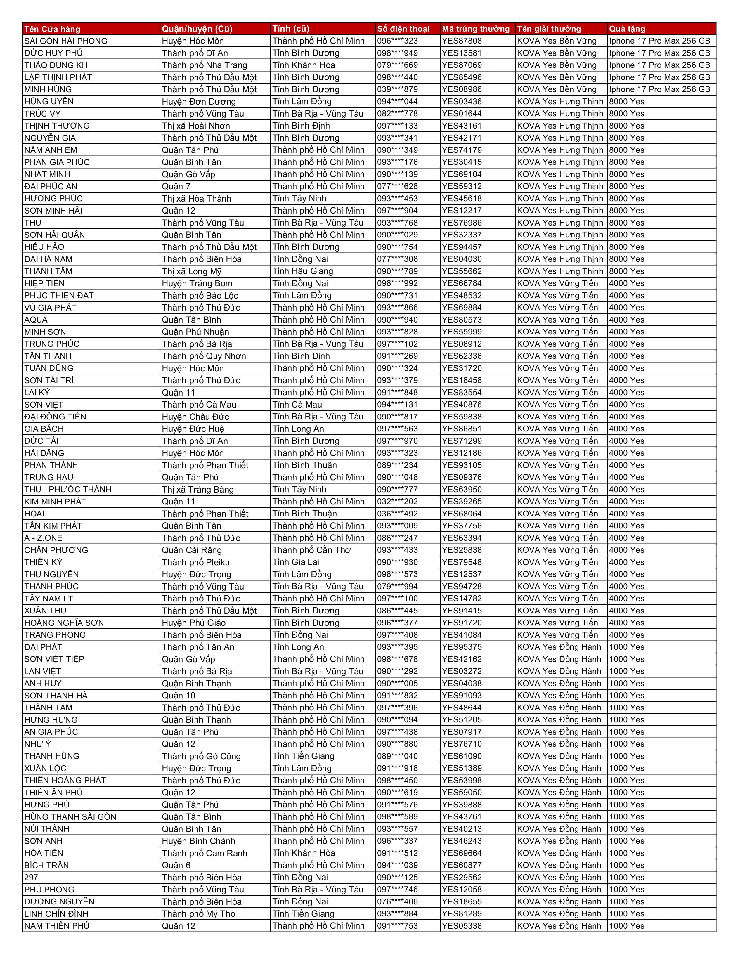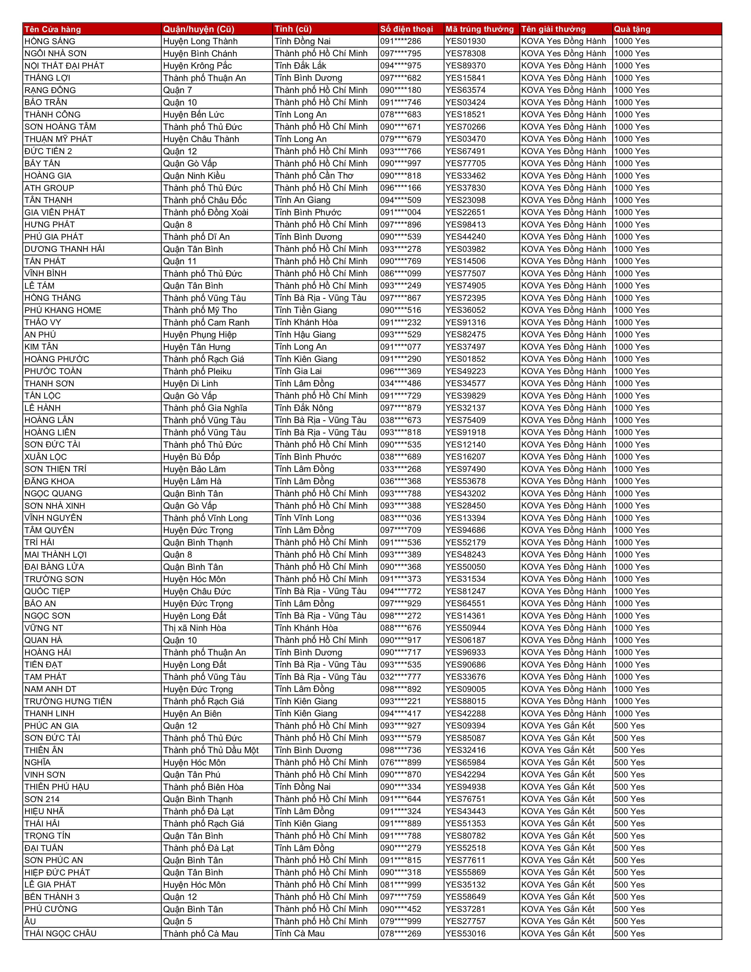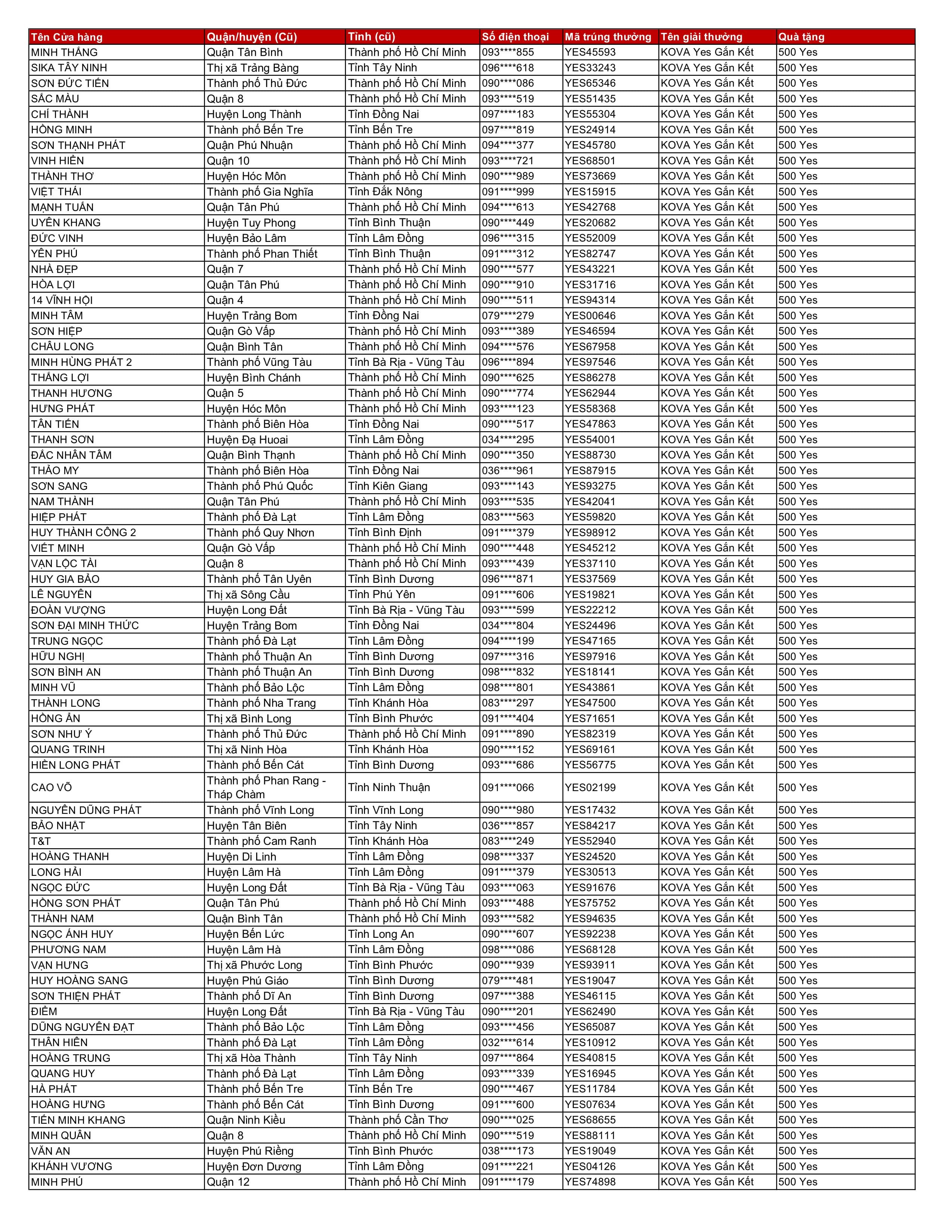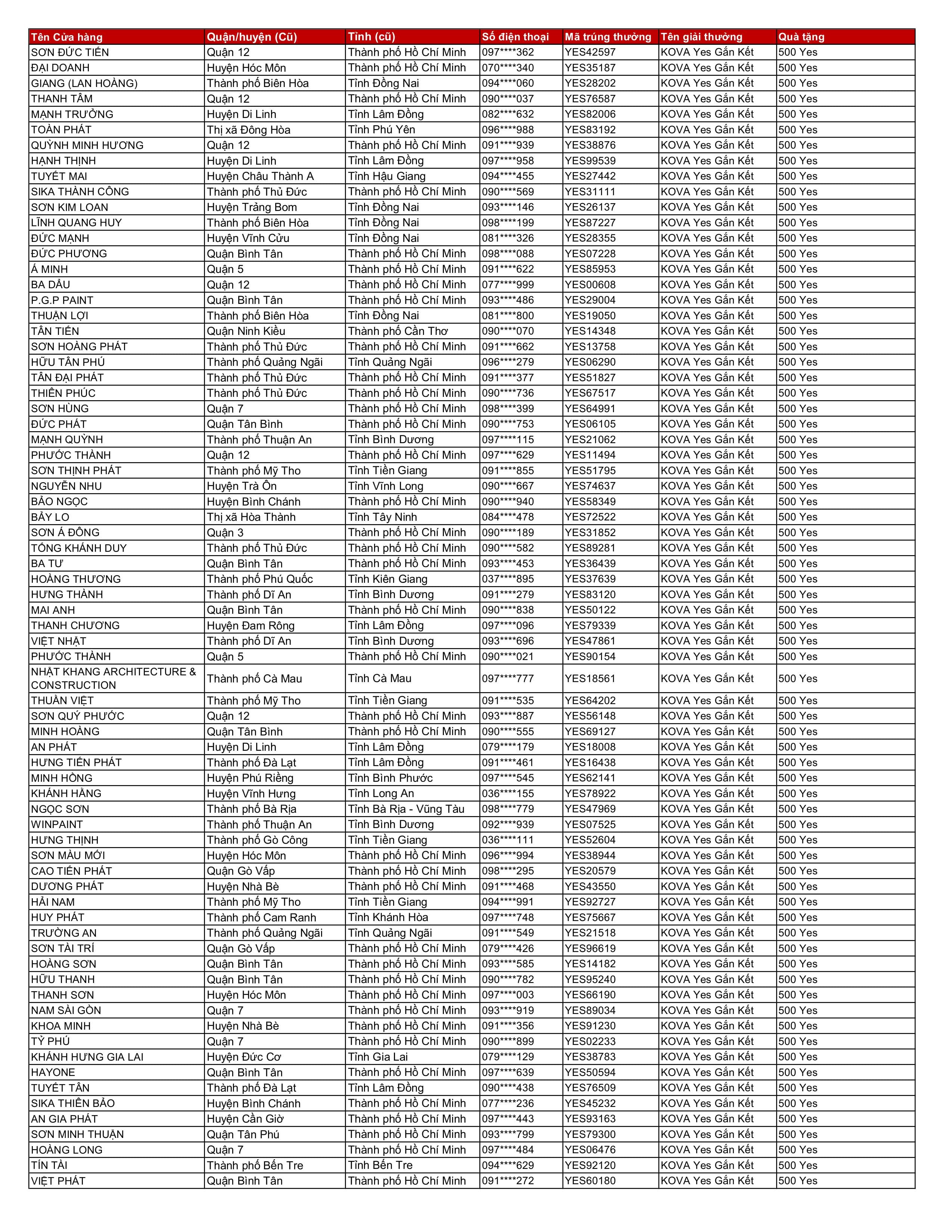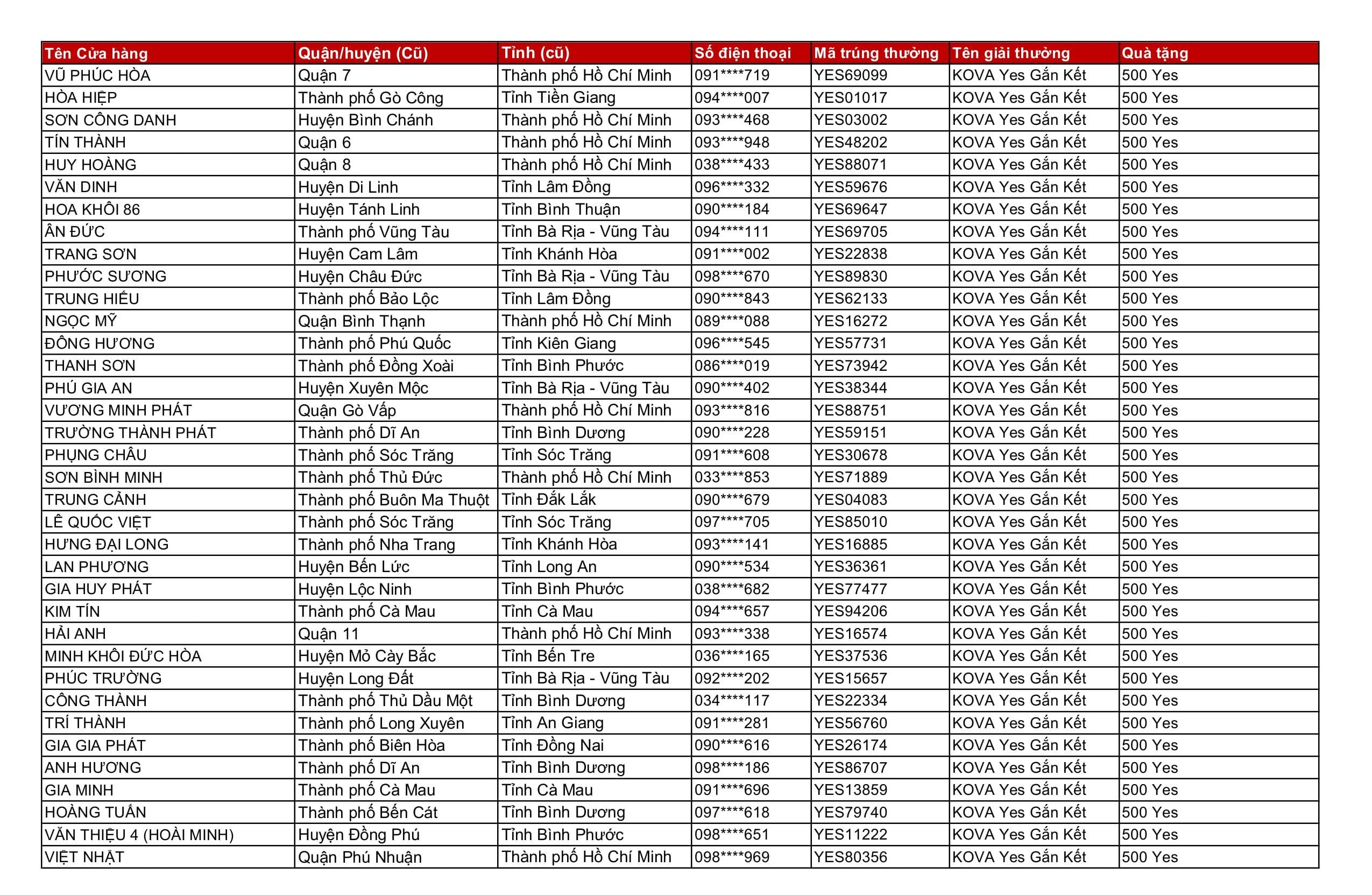 Ngày 26 tháng 12 năm 2025 vừa qua Livestream quay thưởng chương trình Tích Yes Ngay, Vận May Trúng Lớn đã diễn ra tốt đẹp. KOVA xin chúc mừng các Quý khách đã trúng giải trong chương trình và đặc biệt dành lời cảm ơn đặc biệt vì đã đồng hành cùng KOVA trong suốt thời gian qua. Bên dưới đây là danh sách trúng giải, và thông tin về việc hình thức và thời gian trả thưởng, trường hợp cần thêm thông tin, xin quý khách vui lòng nhắn tin tới Zalo 0983 567 015.