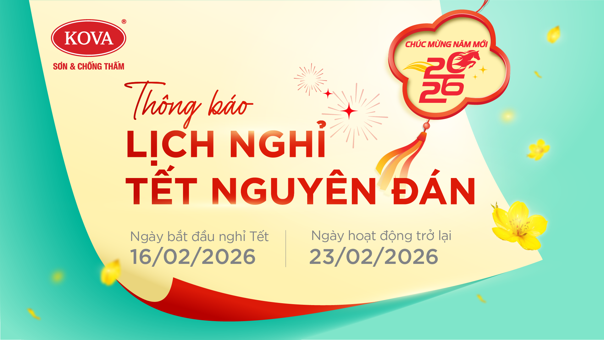 KOVA Commerce xin trân trọng thông báo lịch nghỉ Tết Nguyên Đán 2026, cụ thể như sau: